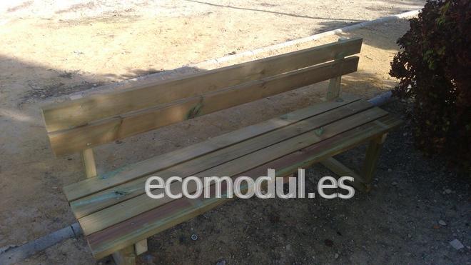 Banco con respaldo, de estructura de madera compuesta por pies, asiento y respaldo en pino Suecia.